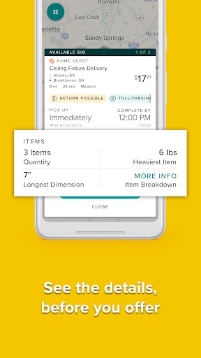 The app facilitates a broad range of deliveries, including retail merchandise, home improvement supplies, medical equipment, and airline luggage. Drivers can see the item size, approximate distance, and fee before accepting a gig. You must have a suitable vehicle for the item's dimensions.